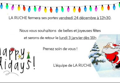 Fermeture de LA RUCHE du 24 décembre au 3 janvier.